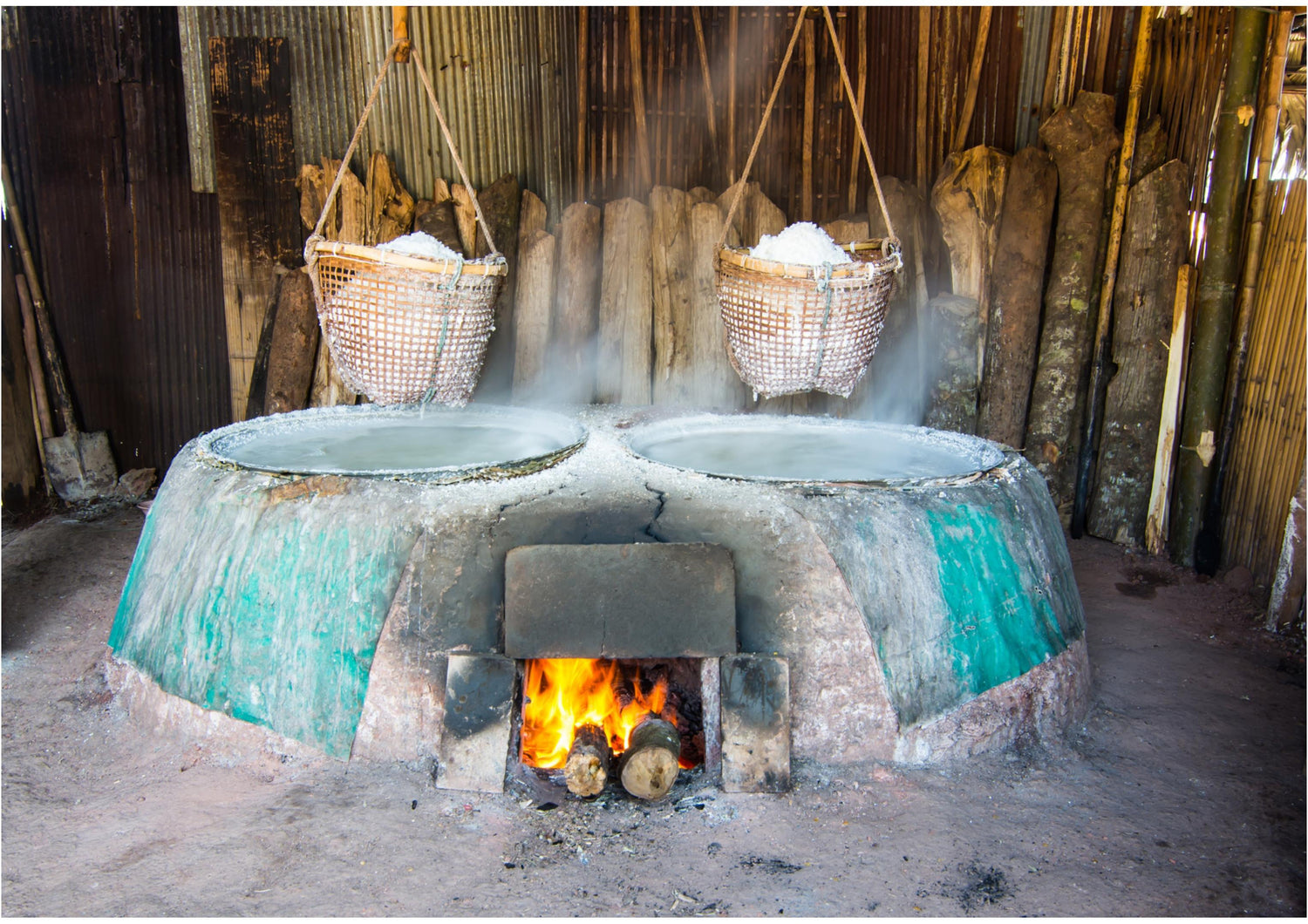Danach wird die Sole gekocht, bis weiße Kristalle entstehen.
